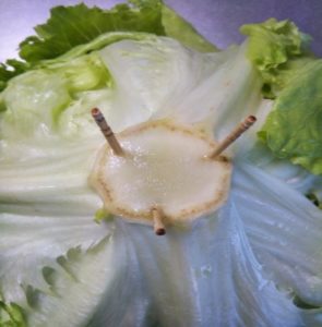 芯をくり抜くのが大変な時は生長点に傷をつけても生長が止まる為、芯の部分に4か所包丁で切り込みを入れても長持ちさせる事が出来ます。