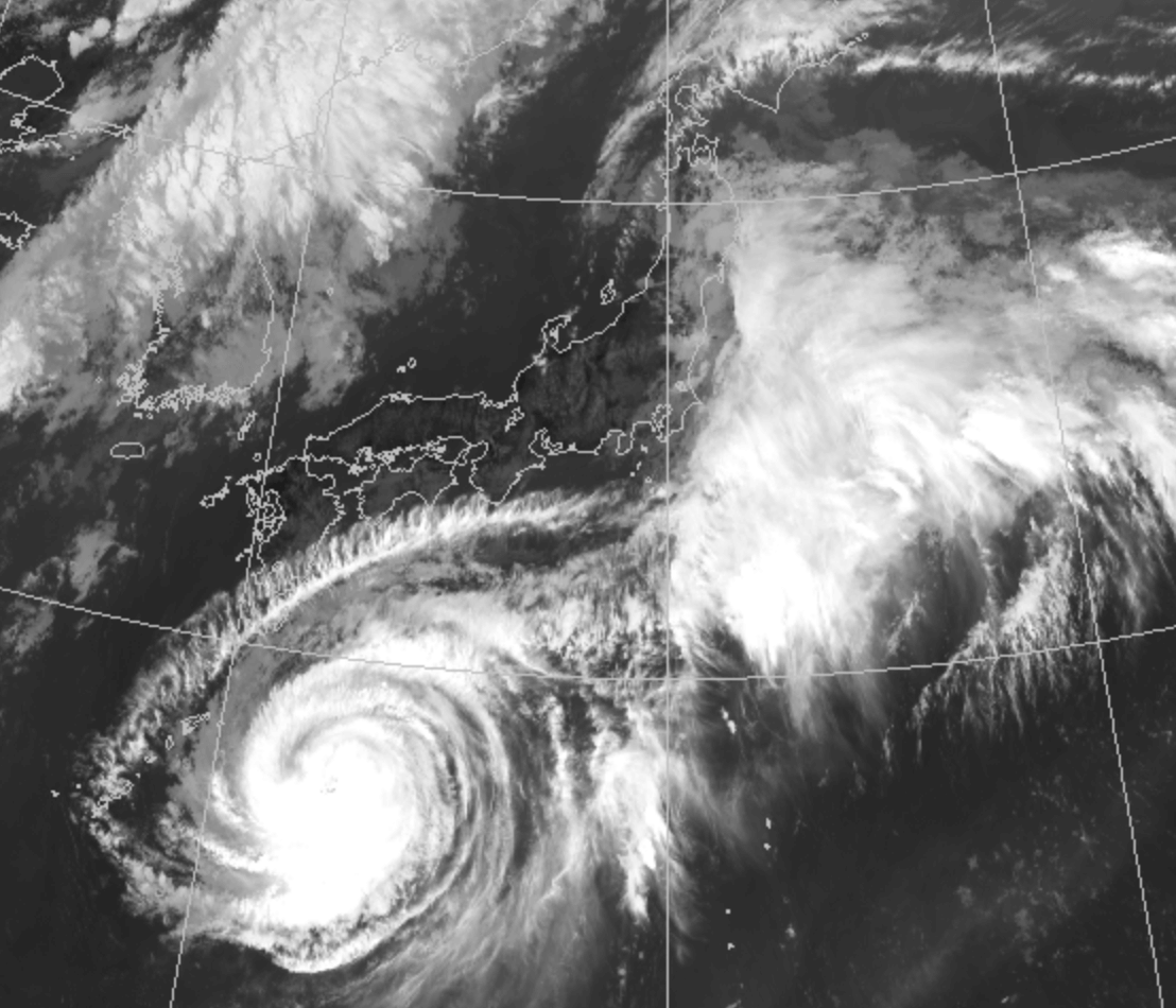 台風の中心にある雲がくっきりと白くなっているのがわかりますか?