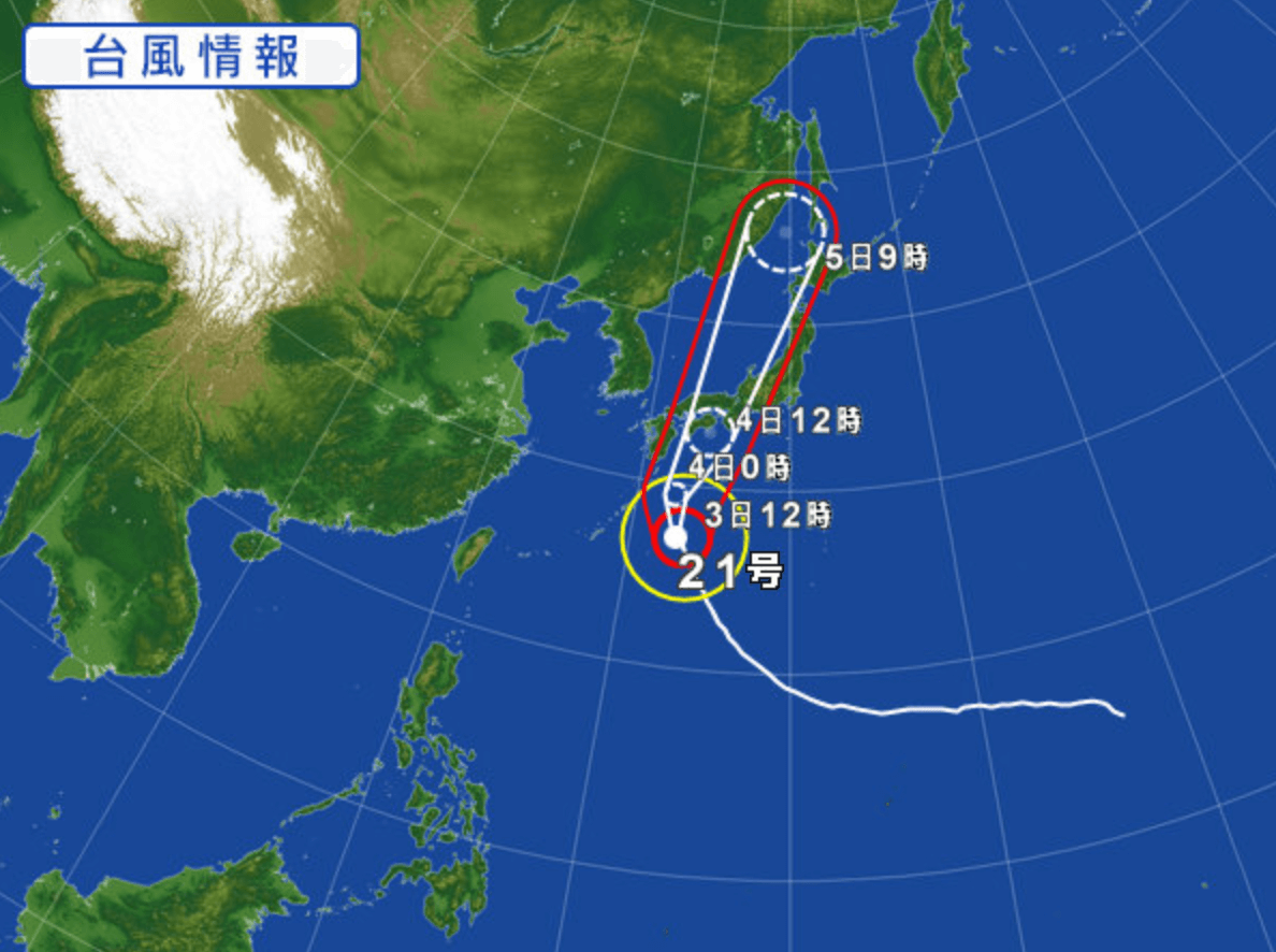 非常に強い台風21号は、四国や近畿に上陸し日本海側に抜け、日本列島の日本海側をかするように北上し、北海道に到達するという進路が予想されています。